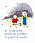 Oh là, là, quels gros nuages noirs là-bas au loin, et quel souffle dans les bourrasques de vent ! Ça y est, la tempête arrive, annoncée par de grosses gouttes de pluie : elle fait voler les feuilles des arbres et claquer les volets de la maison ! Vite, il faut rentrer, dit Maman à Émilie et Stéphane ! Mais à l'intérieur, même bien au sec, il fait tout sombre... Et encore plus lorsque la tempête fait sauter l'électricité : ça y est, c'est la panne !